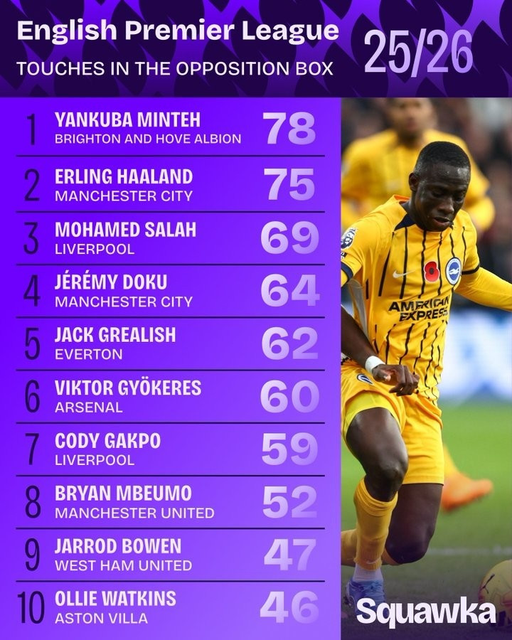 直播吧11月11日讯英超联赛已经进行了11轮,squakwa也统计了本赛季英超在对方禁区内触球次数情况,明特力压哈兰德居首。